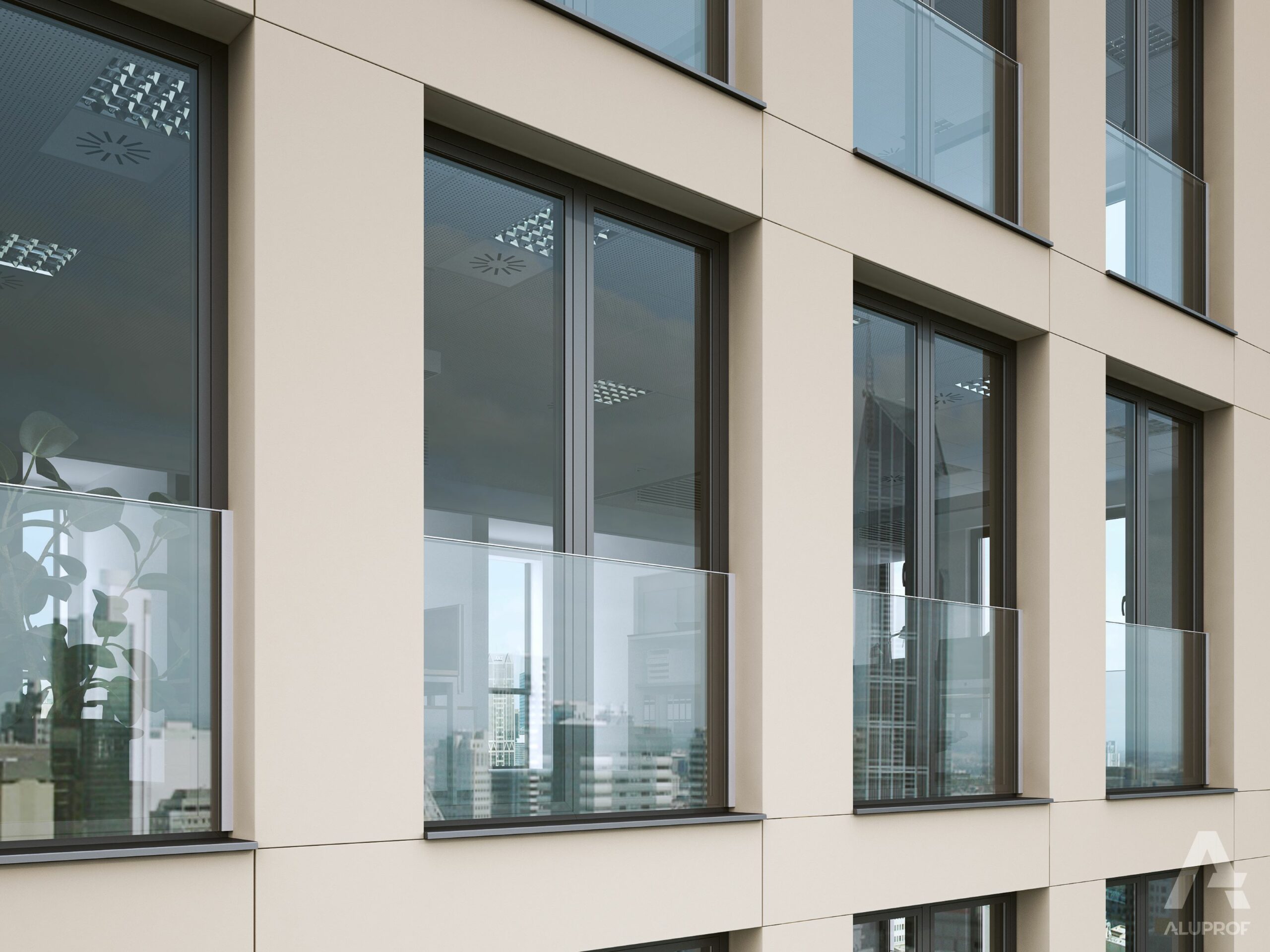 Fenster aus Aluminium haben Flügel, die von der Außenseite des Gebäudes nicht sichtbar sind.